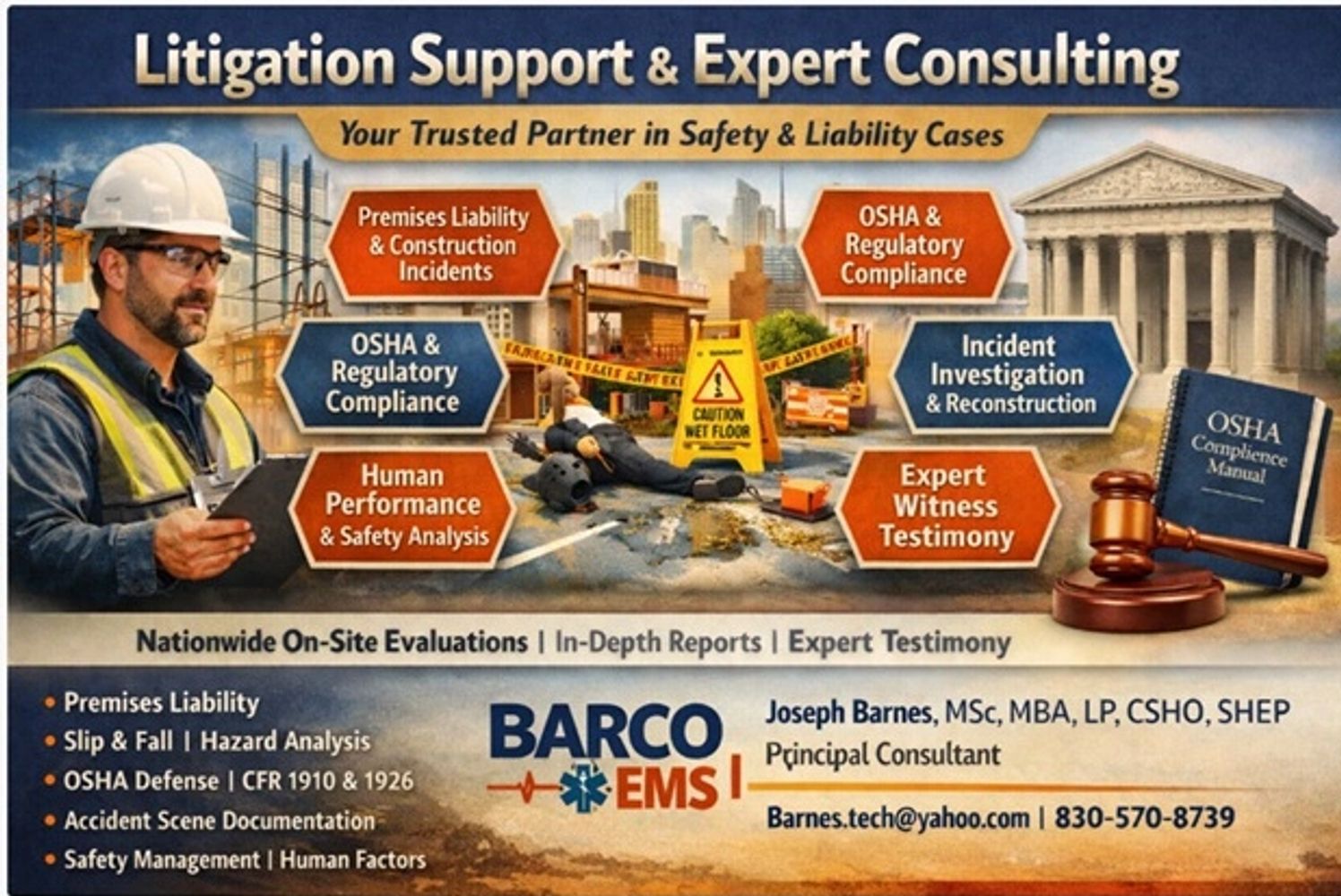 Professional services in support to legal teams, both Defense and Plaintiff, around the country. From Safety, On the job injuries, Premises Liability, DOT, Ladders, Excavations, Trips and Falls, to Failed Safety Programs, EMS, EMT & Paramedic claims we can help you build your case. Attorney references available from across the country.